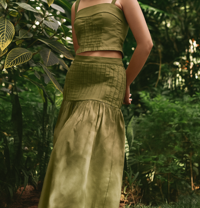 El lino aporta textura y frescura, mientras el tono salmón ilumina la piel con suavidad.