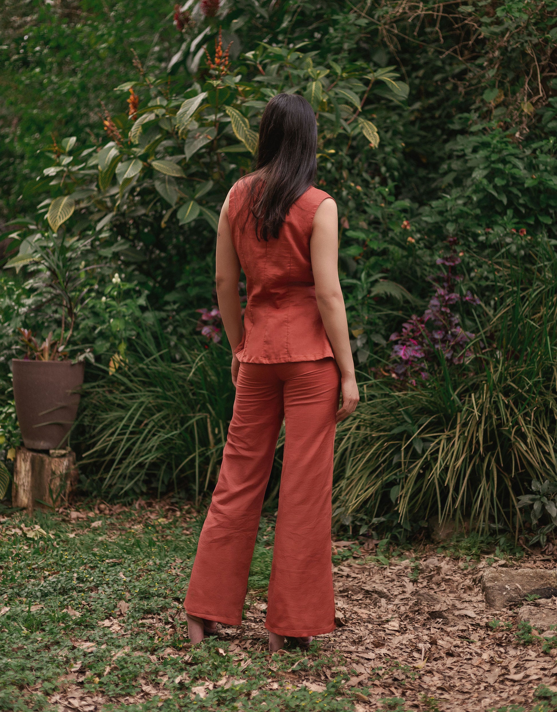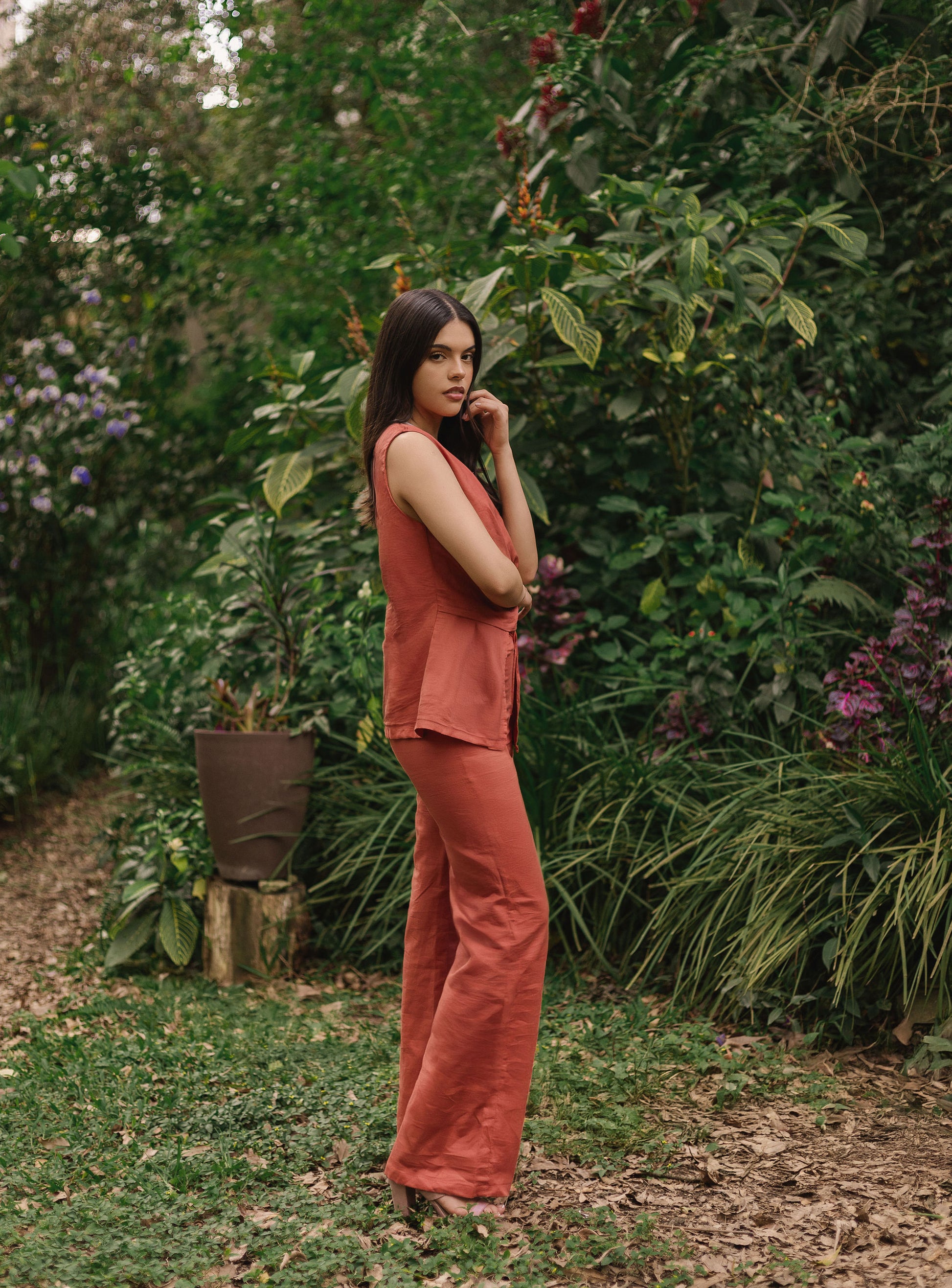 Terra es un set en lino que combina la fuerza de la tierra con la elegancia natural del color terracota. Su pantalón palazzo aporta movimiento y presencia, mientras la blusa ajustada define la silueta con sutileza y sofisticación. Un look fresco, moderno y auténtico para mujeres que aman vestir con carácter y encanto.