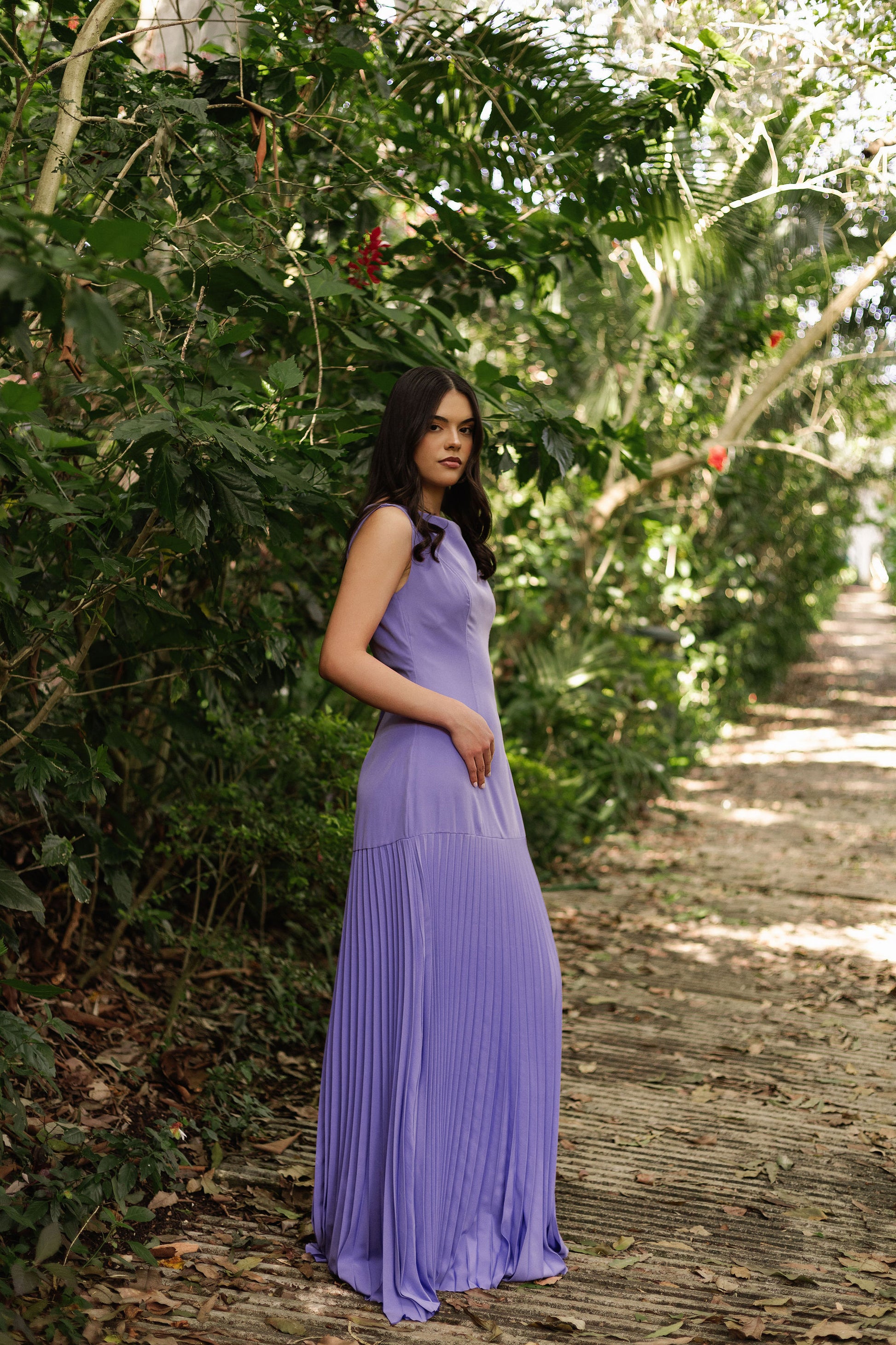 Vestido Alba – suave y etéreo como la primera luz del día. Su caída fluida y su tono lila transmiten serenidad y elegancia.