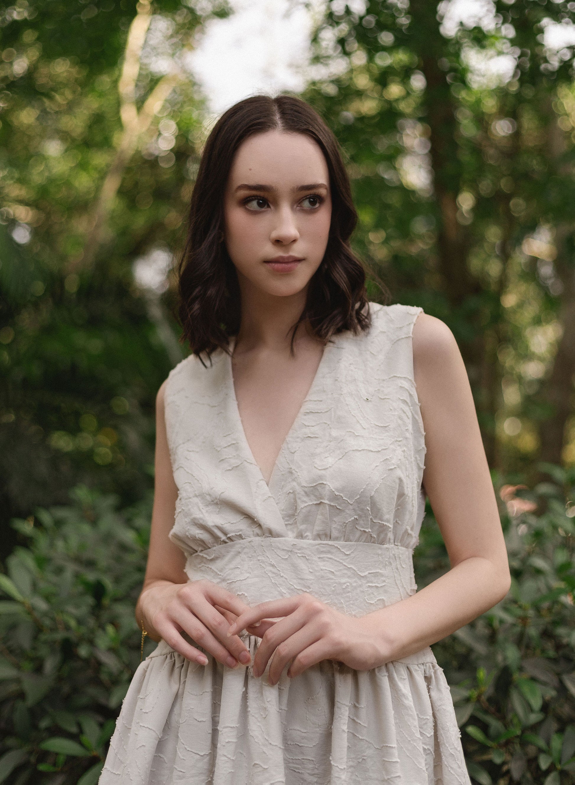 Confeccionado en lino tono marfil y sutiles detalles tipo yute, celebra la belleza de lo orgánico con un diseño fresco, delicado y auténtico.
